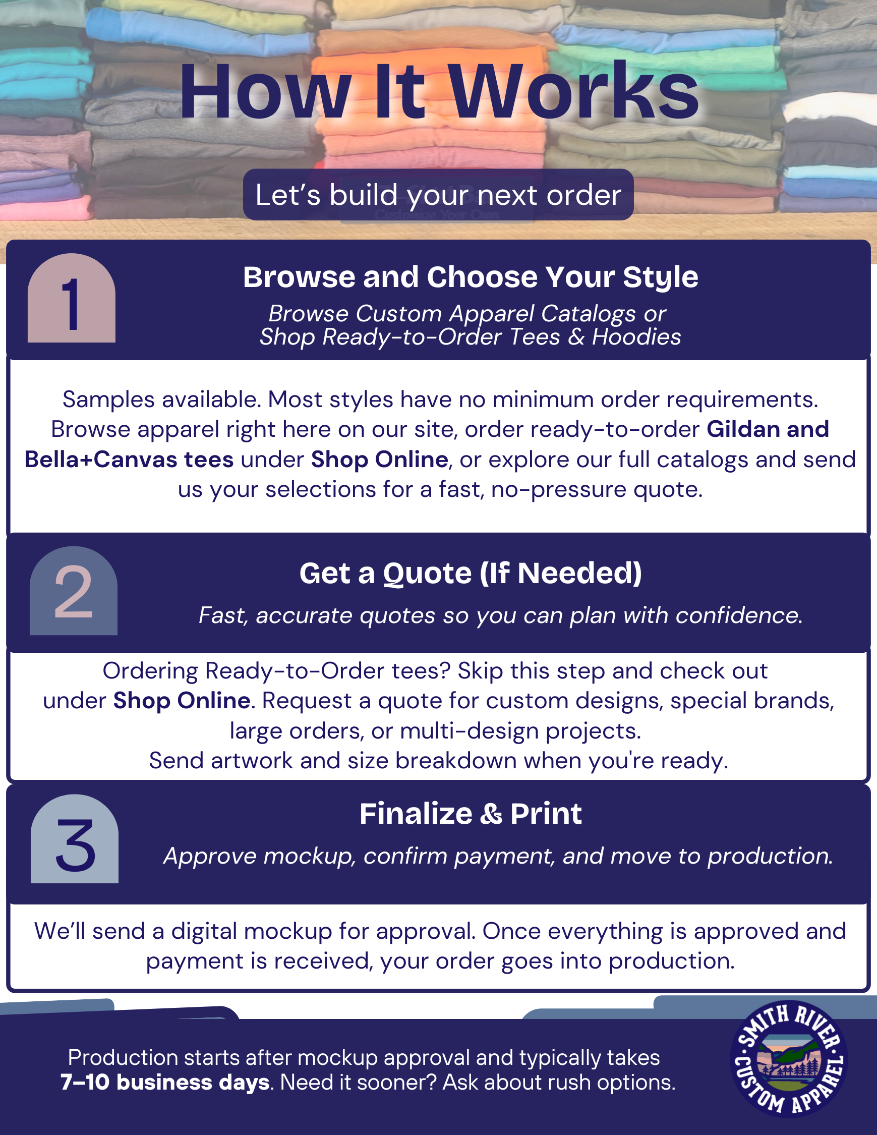 Shop Ready-to-Order Custom Tees & Hoodies (most styles with no minimums) or Browse Our Montana Graphic Apparel Line